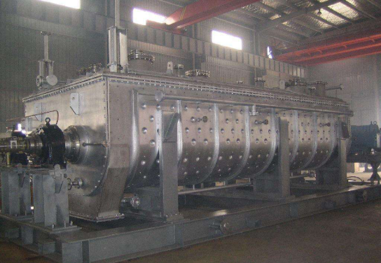 空心軸上密集排列著楔型中空漿葉,熱介質(zhì)經(jīng)空心軸流經(jīng)漿葉。單位有效容積內(nèi)傳熱面積很大,熱介質(zhì)溫度從-40℃到320℃,可以是水蒸汽,也可以是液體型:如熱水、導(dǎo)熱油等。間接傳導(dǎo)加熱,沒有攜帶空氣帶走熱量,熱量均用來加熱物料。熱量損失僅為通過器體保溫層向環(huán)境的散熱。楔型漿葉傳熱面具有自清潔功能。物料顆粒與楔型面的相對運(yùn)動產(chǎn)生洗刷作用,能夠洗刷掉楔型面上附著物料,使運(yùn)轉(zhuǎn)中一直保持著清潔的傳熱面。漿葉干燥機(jī)的殼體為Ω型,殼體內(nèi)一般安排二到四根空心攪拌軸。殼體有密封端蓋與上蓋,防止物料粉塵外泄而充分發(fā)揮作用。